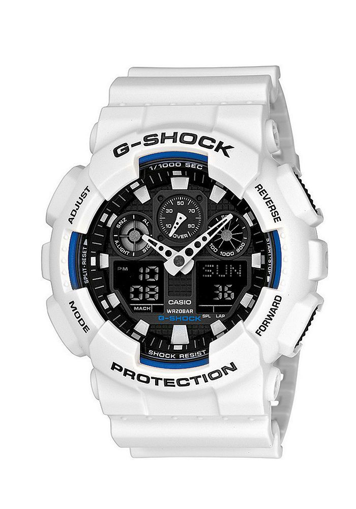 Casio G-Shock GA-100B-7 White resin black face blue inner bezel ring analog-digital