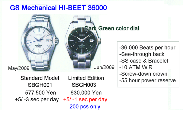 Seiya-San has posted news of the Grand Seiko Mechanical watch. The a white dial HI-BEET 36000 will be released in May with a retail price of about $6,000 USD. And there's a dark green face model coming out in June for about $6,500 USD (only 200 produced). It's a classic elegant design that features a transparent case back. Pre-orders have already started.