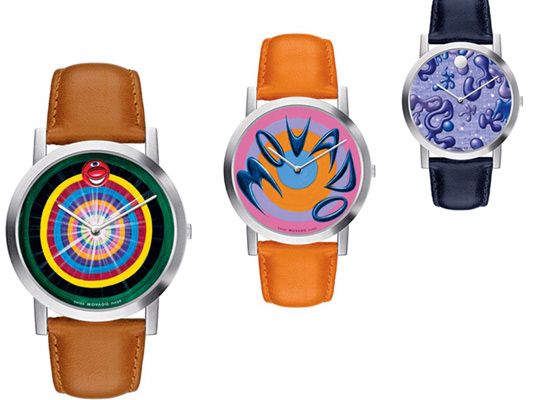 Movado has announced six new limited edition watches designed by Kenny Scharf. All of these models have wildly painted watch faces. They come on a variety of colored leather bands. There will be 100 of each model available for $695 USD. And there's also 25 box sets of every model that will cost you $3,495 USD.