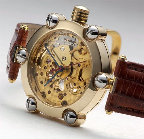 The Pedum Tourbillon is from watchmakers Peter Voeten and Elly Knepper in the Netherlands. There's definitely a nautical them to this steampunk looking watch. The gold case and fantastic mechanical movement make for a work of art. Follow the link over to see all the work that goes into creating one of these timepieces.