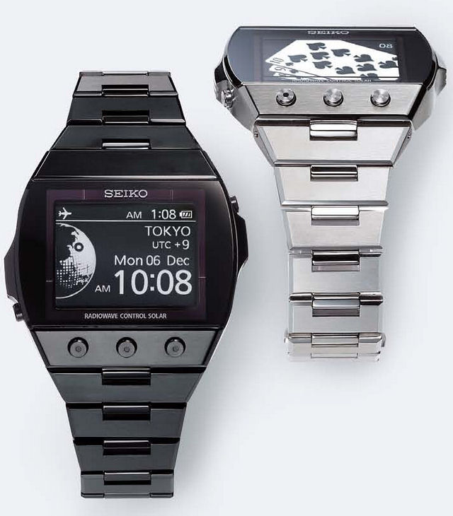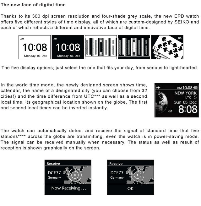 Seiko has announced details on their new EPD watch with an innovative active matrix display. The high resolution 300 dpi e-ink screen allows a whole range of functions to be displayed on the screen without using too much battery life. Similar to the technology used in ebook readers like the Amazon Kindle, this watch will be easily readable from most any viewing angle. It's whole new type of digital watch. Being able to reconfigure the entire display on demand allows for a wide range of interfaces and options. These also have an atomic time sync feature and solar charging. The battery will last up to nine months without any exposure to light. Look for these new watches to be released later this year.