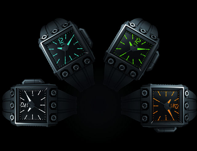 The watch looks very industrial with the front of the watch adorned by 6 very large hex-bolts. There's three on the top and three at the bottom. The font used for the hour index markers are reminiscent of the digits seen on digital watches. Besides a number of dial color variations, the watch is available in stainless steel or a PVD/stainless steel combination.