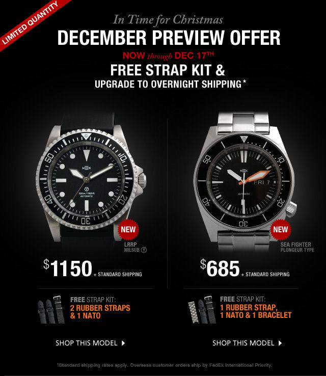 MKII is having a December Preview Sale from now until December 17. The models on this offer are the LRRP Milsub and the Sea Fighter Plongeur Type watches. The quantities are limited and if you order now, the watches will come with the extra strap kit and free upgrade to overnight shipping (US only). These watches makes great stocking stuffers for Christmas. The LRRP will retail for $1,150 USD, while the Sea Fighter retails for $685 USD.